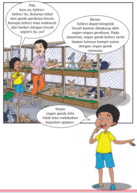 “Memang demikian, Edo. Kelinci dapat meloncat-loncat dan berlari seperti tidak pernah lelah karena memiliki organ gerak yang kuat,” kata Pak Rudi.